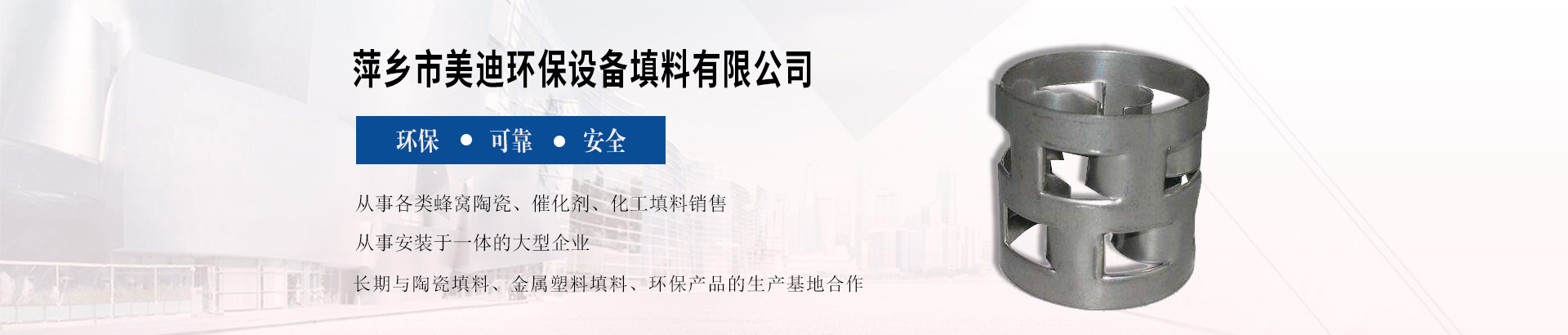萍鄉(xiāng)市美迪環(huán)保設(shè)備填料有限公司前身為建于70年代的原萍鄉(xiāng)市化工填料公司。公司位于“中國工業(yè)陶瓷之都”――江西省萍鄉(xiāng)市湘東區(qū)下埠工業(yè)園,緊鄰滬昆高鐵、浙贛鐵路、滬瑞高速和國道319、320線,臨距黃花國...